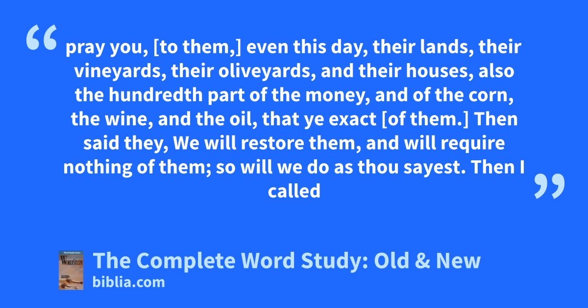 pray you, [to them,] even this day, their lands, their vineyards, their oliveyards, and their houses, also the hundredth part of the money, and of the corn, the wine, and the oil, that ye exact [of them.] Then said they, We will restore them, and will require nothing of them; so will we do as thou sayest. Then I called