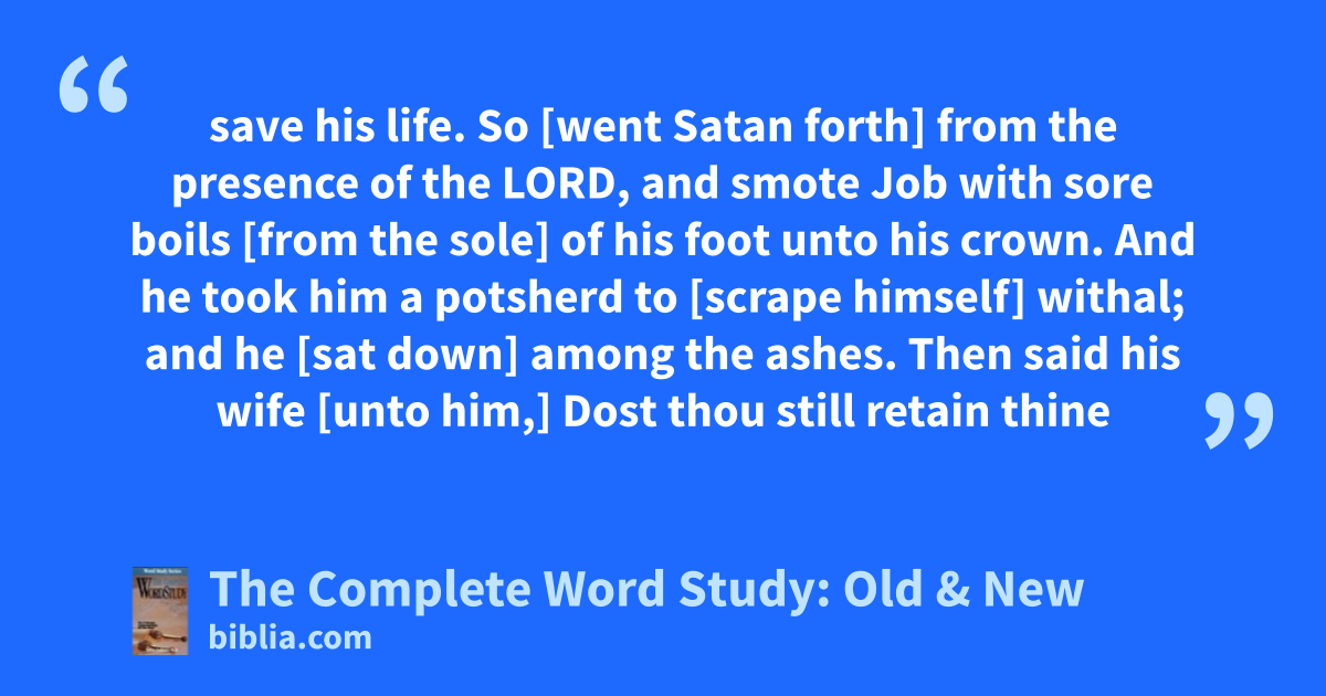 save his life. So [went Satan forth] from the presence of the LORD, and smote Job with sore boils [from the sole] of his foot unto his crown. And he took him a potsherd to [scrape himself] withal; and he [sat down] among the ashes. Then said his wife [unto him,] Dost thou still retain thine