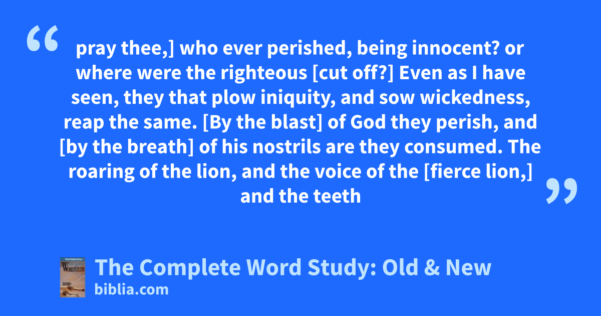 pray thee,] who ever perished, being innocent? or where were the righteous [cut off?] Even as I have seen, they that plow iniquity, and sow wickedness, reap the same. [By the blast] of God they perish, and [by the breath] of his nostrils are they consumed. The roaring of the lion, and the voice of the [fierce lion,] and the teeth