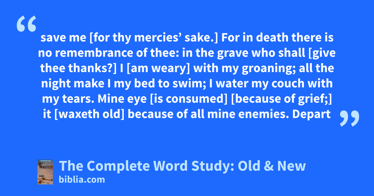 save me [for thy mercies’ sake.] For in death there is no remembrance of thee: in the grave who shall [give thee thanks?] I [am weary] with my groaning; all the night make I my bed to swim; I water my couch with my tears. Mine eye [is consumed] [because of grief;] it [waxeth old] because of all mine enemies. Depart