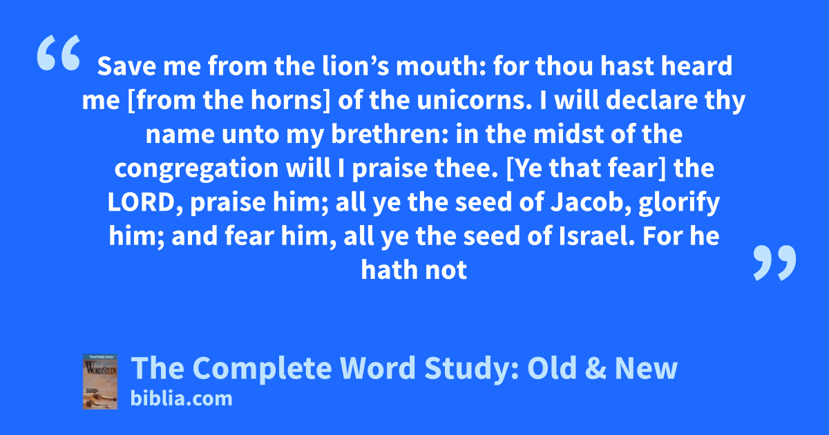 Save me from the lion’s mouth: for thou hast heard me [from the horns] of the unicorns. I will declare thy name unto my brethren: in the midst of the congregation will I praise thee. [Ye that fear] the LORD, praise him; all ye the seed of Jacob, glorify him; and fear him, all ye the seed of Israel. For he hath not