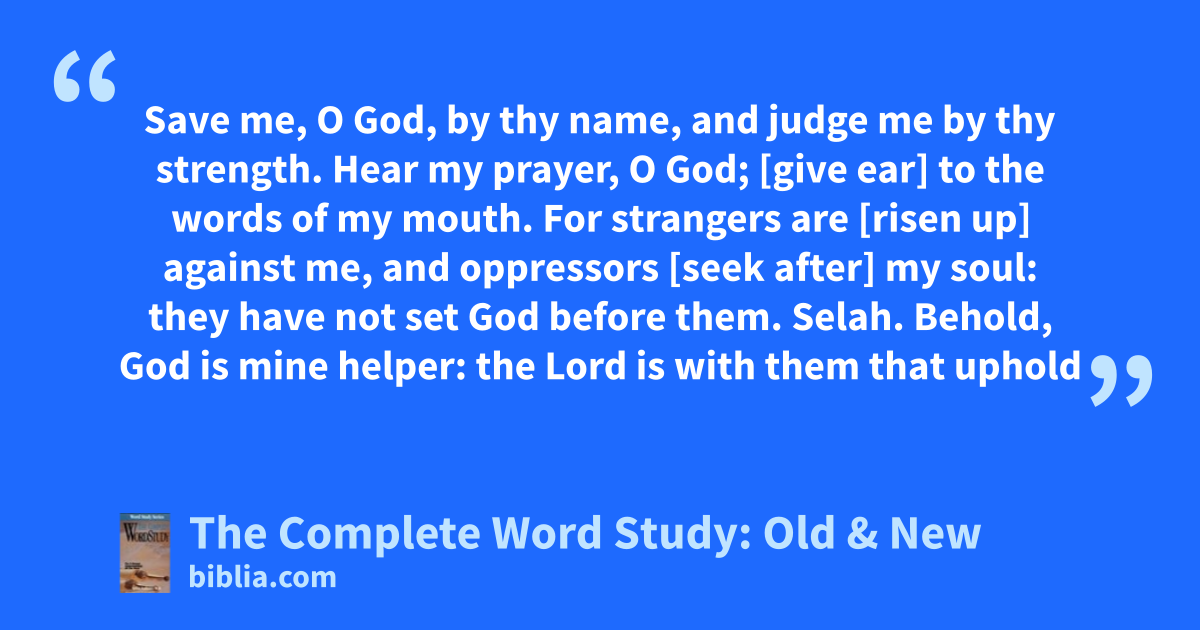 Save me, O God, by thy name, and judge me by thy strength. Hear my prayer, O God; [give ear] to the words of my mouth. For strangers are [risen up] against me, and oppressors [seek after] my soul: they have not set God before them. Selah. Behold, God is mine helper: the Lord is with them that uphold