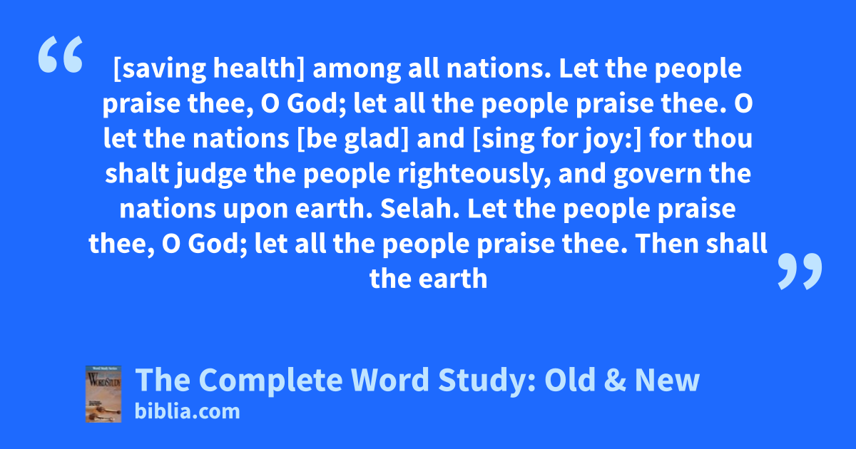[saving health] among all nations. Let the people praise thee, O God; let all the people praise thee. O let the nations [be glad] and [sing for joy:] for thou shalt judge the people righteously, and govern the nations upon earth. Selah. Let the people praise thee, O God; let all the people praise thee. Then shall the earth