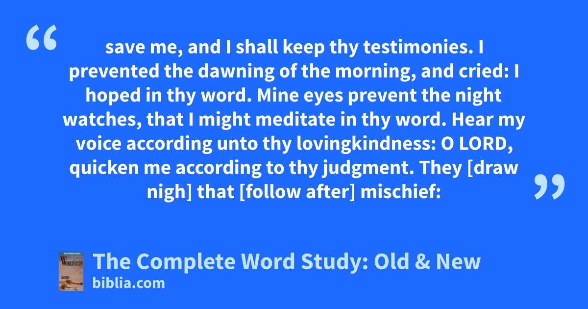 save me, and I shall keep thy testimonies. I prevented the dawning of the morning, and cried: I hoped in thy word. Mine eyes prevent the night watches, that I might meditate in thy word. Hear my voice according unto thy lovingkindness: O LORD, quicken me according to thy judgment. They [draw nigh] that [follow after] mischief: