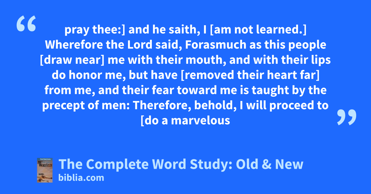 pray thee:] and he saith, I [am not learned.] Wherefore the Lord said, Forasmuch as this people [draw near] me with their mouth, and with their lips do honor me, but have [removed their heart far] from me, and their fear toward me is taught by the precept of men: Therefore, behold, I will proceed to [do a marvelous