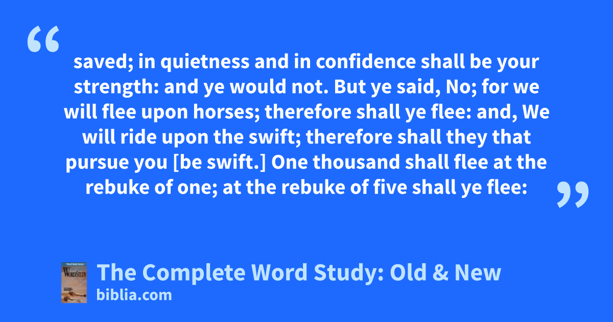 saved; in quietness and in confidence shall be your strength: and ye would not. But ye said, No; for we will flee upon horses; therefore shall ye flee: and, We will ride upon the swift; therefore shall they that pursue you [be swift.] One thousand shall flee at the rebuke of one; at the rebuke of five shall ye flee: