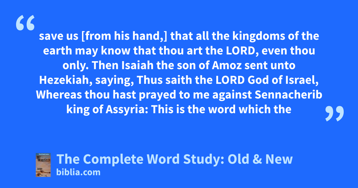 save us [from his hand,] that all the kingdoms of the earth may know that thou art the LORD, even thou only. Then Isaiah the son of Amoz sent unto Hezekiah, saying, Thus saith the LORD God of Israel, Whereas thou hast prayed to me against Sennacherib king of Assyria: This is the word which the