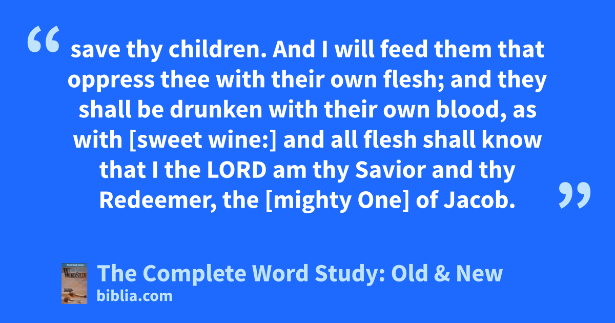 save thy children. And I will feed them that oppress thee with their own flesh; and they shall be drunken with their own blood, as with [sweet wine:] and all flesh shall know that I the LORD am thy Savior and thy Redeemer, the [mighty One] of Jacob.
