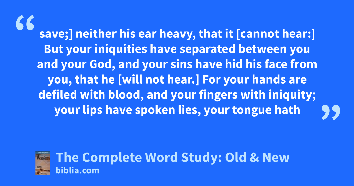 save;] neither his ear heavy, that it [cannot hear:] But your iniquities have separated between you and your God, and your sins have hid his face from you, that he [will not hear.] For your hands are defiled with blood, and your fingers with iniquity; your lips have spoken lies, your tongue hath