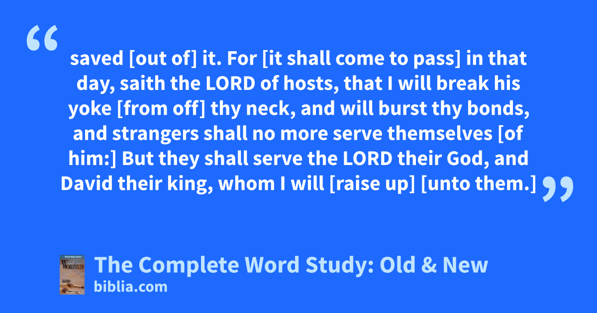 saved [out of] it. For [it shall come to pass] in that day, saith the LORD of hosts, that I will break his yoke [from off] thy neck, and will burst thy bonds, and strangers shall no more serve themselves [of him:] But they shall serve the LORD their God, and David their king, whom I will [raise up] [unto them.]