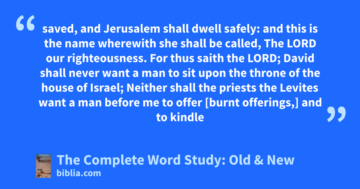 saved, and Jerusalem shall dwell safely: and this is the name wherewith she shall be called, The LORD our righteousness. For thus saith the LORD; David shall never want a man to sit upon the throne of the house of Israel; Neither shall the priests the Levites want a man before me to offer [burnt offerings,] and to kindle