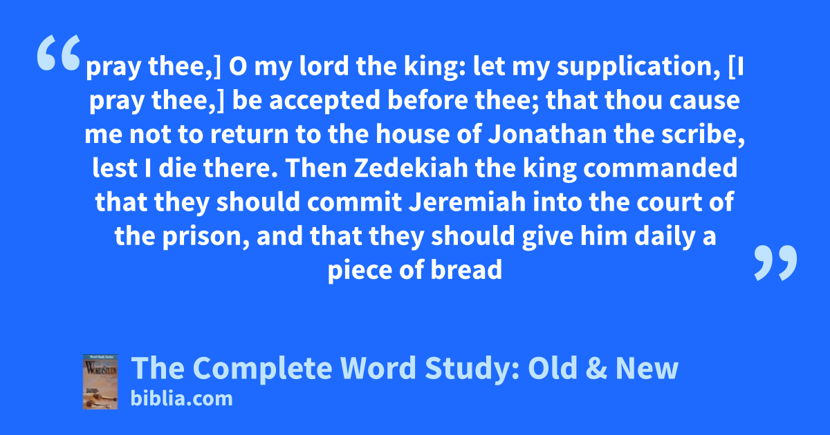 pray thee,] O my lord the king: let my supplication, [I pray thee,] be accepted before thee; that thou cause me not to return to the house of Jonathan the scribe, lest I die there. Then Zedekiah the king commanded that they should commit Jeremiah into the court of the prison, and that they should give him daily a piece of bread