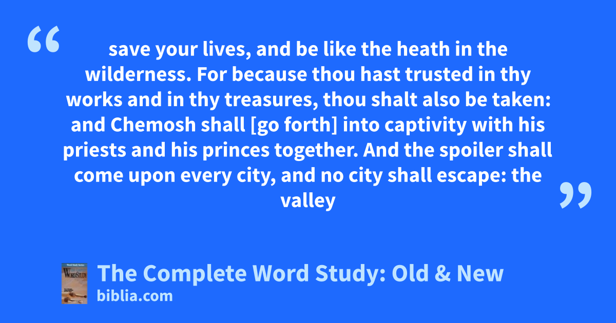 save your lives, and be like the heath in the wilderness. For because thou hast trusted in thy works and in thy treasures, thou shalt also be taken: and Chemosh shall [go forth] into captivity with his priests and his princes together. And the spoiler shall come upon every city, and no city shall escape: the valley