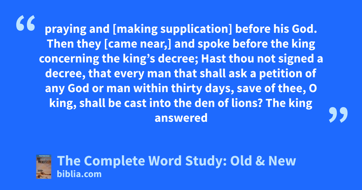 praying and [making supplication] before his God. Then they [came near,] and spoke before the king concerning the king’s decree; Hast thou not signed a decree, that every man that shall ask a petition of any God or man within thirty days, save of thee, O king, shall be cast into the den of lions? The king answered