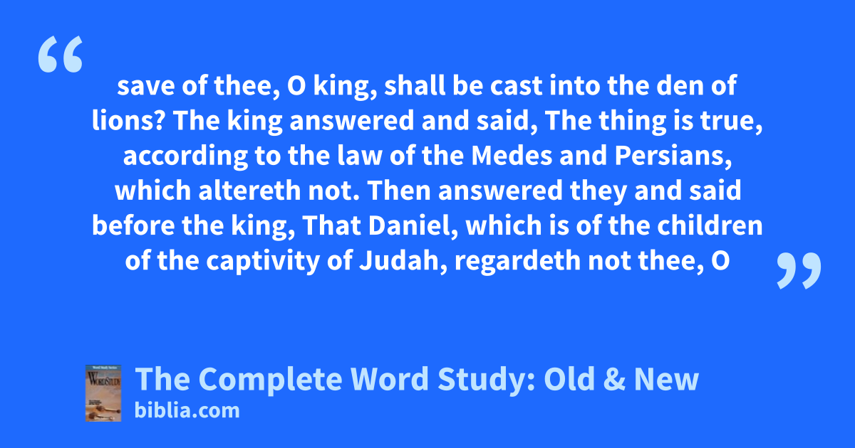 save of thee, O king, shall be cast into the den of lions? The king answered and said, The thing is true, according to the law of the Medes and Persians, which altereth not. Then answered they and said before the king, That Daniel, which is of the children of the captivity of Judah, regardeth not thee, O