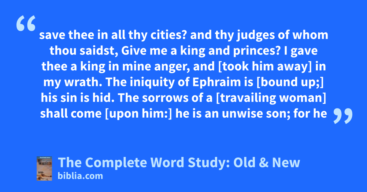 save thee in all thy cities? and thy judges of whom thou saidst, Give me a king and princes? I gave thee a king in mine anger, and [took him away] in my wrath. The iniquity of Ephraim is [bound up;] his sin is hid. The sorrows of a [travailing woman] shall come [upon him:] he is an unwise son; for he