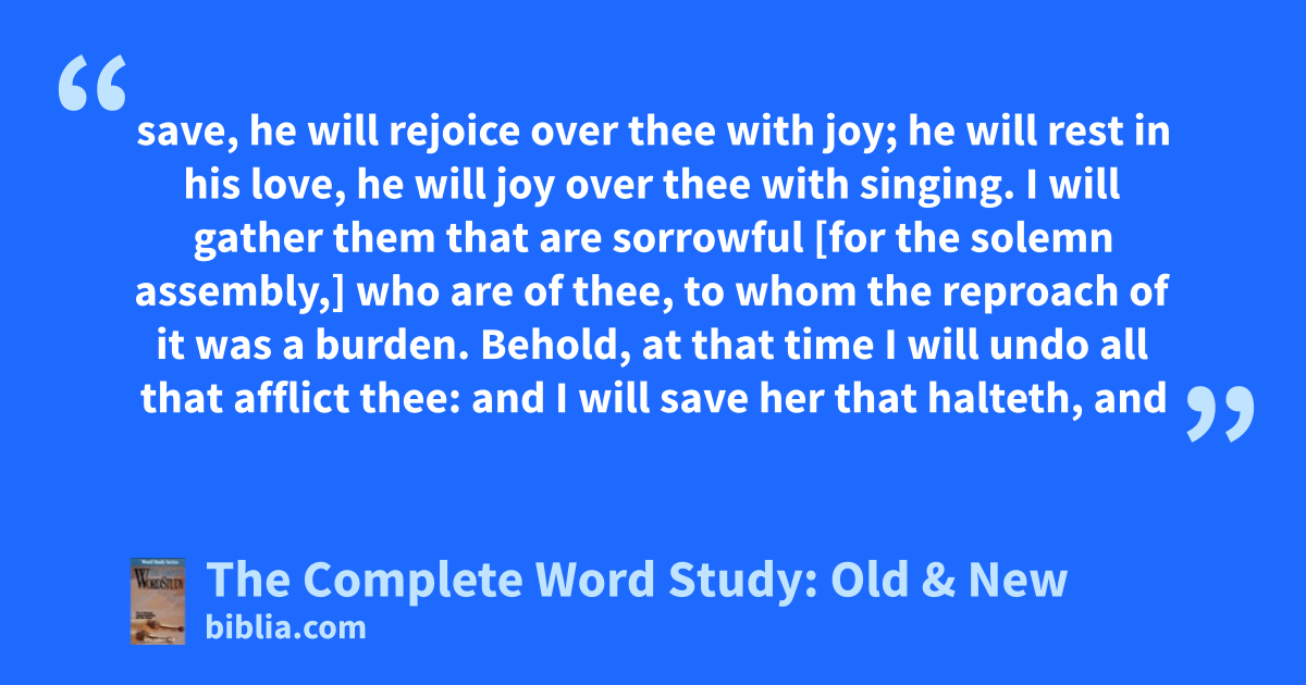 save, he will rejoice over thee with joy; he will rest in his love, he will joy over thee with singing. I will gather them that are sorrowful [for the solemn assembly,] who are of thee, to whom the reproach of it was a burden. Behold, at that time I will undo all that afflict thee: and I will save her that halteth, and