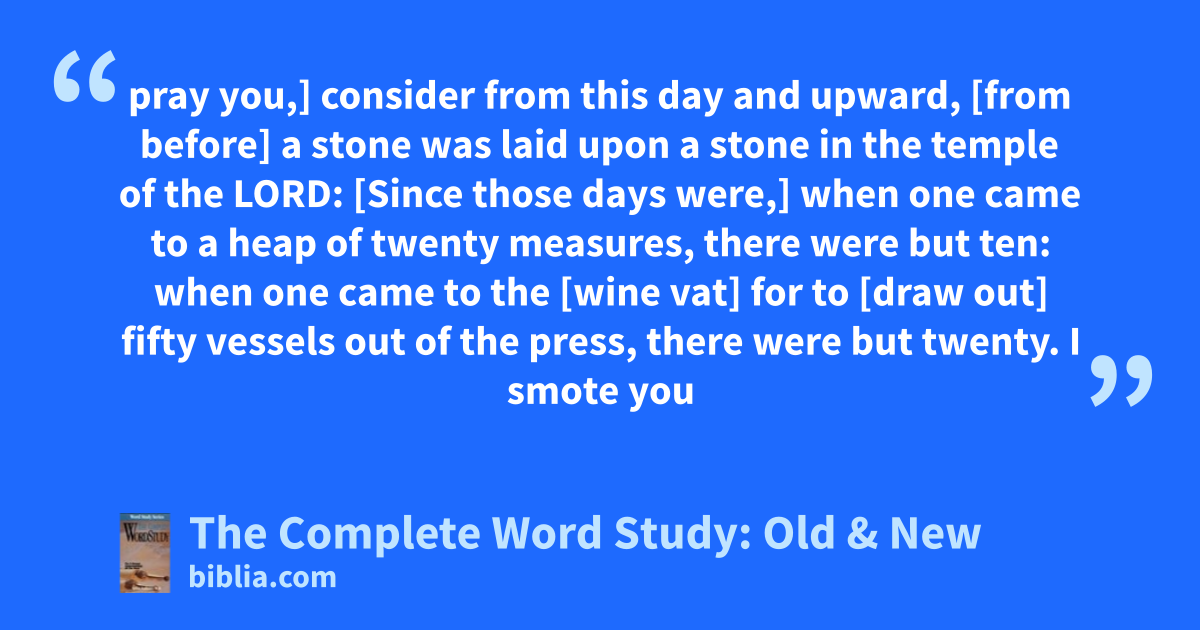 pray you,] consider from this day and upward, [from before] a stone was laid upon a stone in the temple of the LORD: [Since those days were,] when one came to a heap of twenty measures, there were but ten: when one came to the [wine vat] for to [draw out] fifty vessels out of the press, there were but twenty. I smote you
