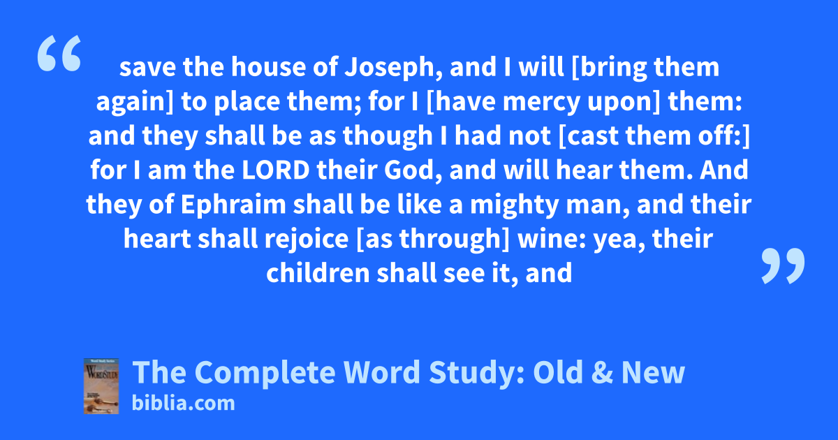 save the house of Joseph, and I will [bring them again] to place them; for I [have mercy upon] them: and they shall be as though I had not [cast them off:] for I am the LORD their God, and will hear them. And they of Ephraim shall be like a mighty man, and their heart shall rejoice [as through] wine: yea, their children shall see it, and