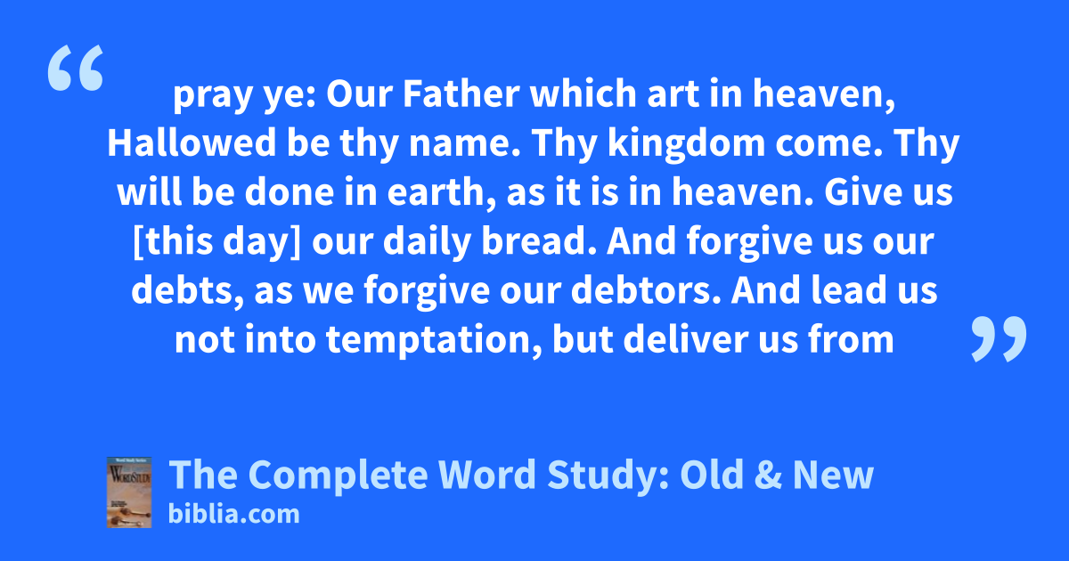 pray ye: Our Father which art in heaven, Hallowed be thy name. Thy kingdom come. Thy will be done in earth, as it is in heaven. Give us [this day] our daily bread. And forgive us our debts, as we forgive our debtors. And lead us not into temptation, but deliver us from