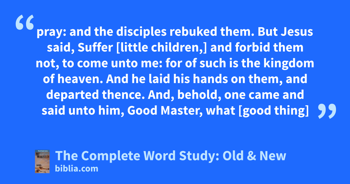 pray: and the disciples rebuked them. But Jesus said, Suffer [little children,] and forbid them not, to come unto me: for of such is the kingdom of heaven. And he laid his hands on them, and departed thence. And, behold, one came and said unto him, Good Master, what [good thing]