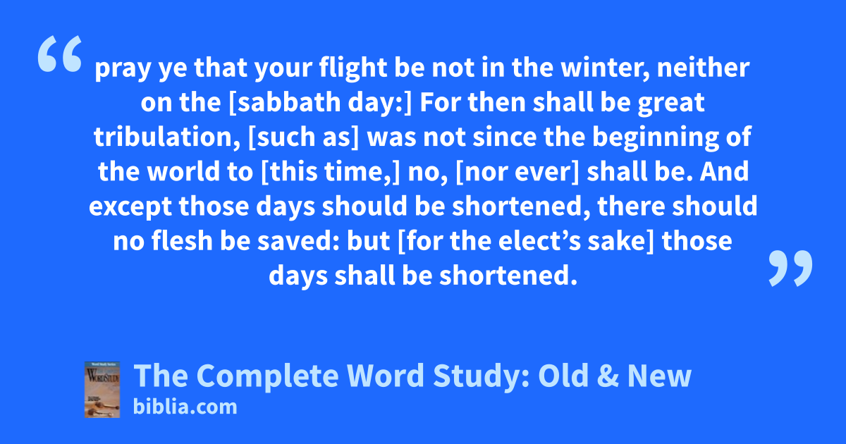 pray ye that your flight be not in the winter, neither on the [sabbath day:] For then shall be great tribulation, [such as] was not since the beginning of the world to [this time,] no, [nor ever] shall be. And except those days should be shortened, there should no flesh be saved: but [for the elect’s sake] those days shall be shortened.