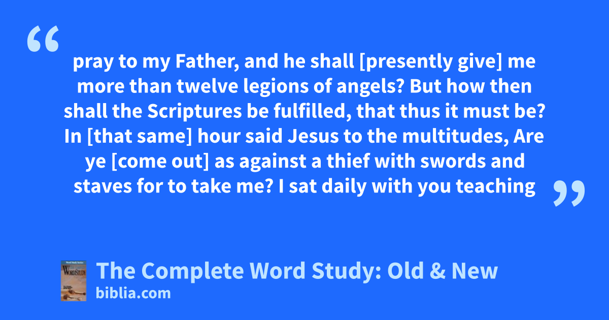 pray to my Father, and he shall [presently give] me more than twelve legions of angels? But how then shall the Scriptures be fulfilled, that thus it must be? In [that same] hour said Jesus to the multitudes, Are ye [come out] as against a thief with swords and staves for to take me? I sat daily with you teaching