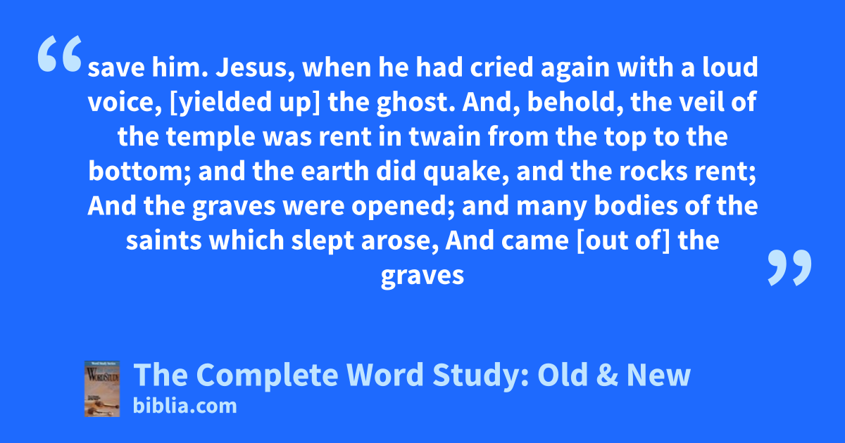 save him. Jesus, when he had cried again with a loud voice, [yielded up] the ghost. And, behold, the veil of the temple was rent in twain from the top to the bottom; and the earth did quake, and the rocks rent; And the graves were opened; and many bodies of the saints which slept arose, And came [out of] the graves