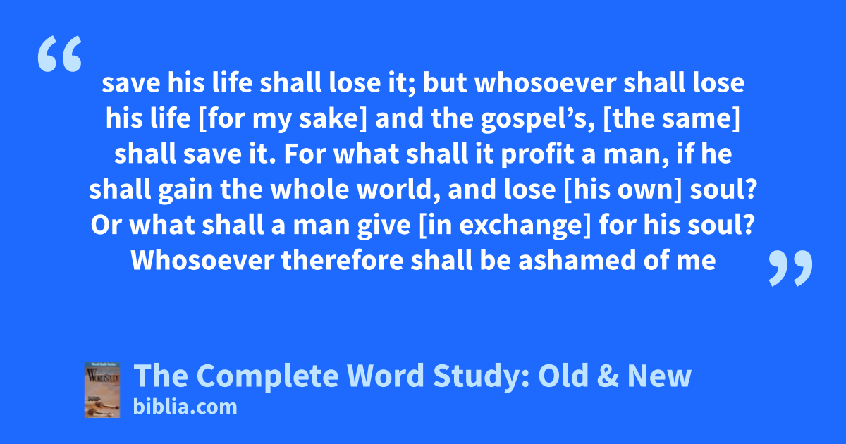 save his life shall lose it; but whosoever shall lose his life [for my sake] and the gospel’s, [the same] shall save it. For what shall it profit a man, if he shall gain the whole world, and lose [his own] soul? Or what shall a man give [in exchange] for his soul? Whosoever therefore shall be ashamed of me