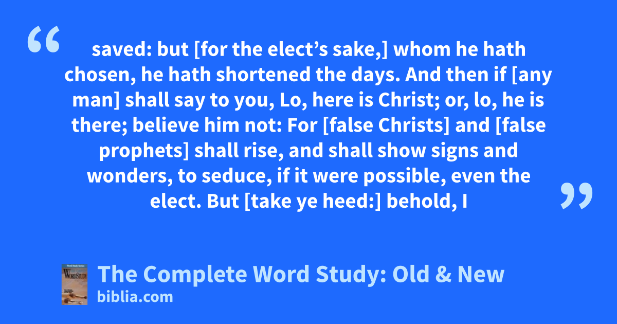 saved: but [for the elect’s sake,] whom he hath chosen, he hath shortened the days. And then if [any man] shall say to you, Lo, here is Christ; or, lo, he is there; believe him not: For [false Christs] and [false prophets] shall rise, and shall show signs and wonders, to seduce, if it were possible, even the elect. But [take ye heed:] behold, I