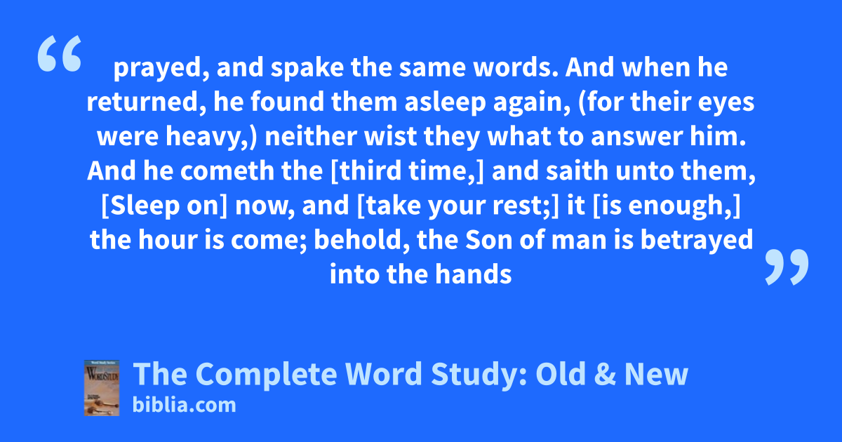 prayed, and spake the same words. And when he returned, he found them asleep again, (for their eyes were heavy,) neither wist they what to answer him. And he cometh the [third time,] and saith unto them, [Sleep on] now, and [take your rest;] it [is enough,] the hour is come; behold, the Son of man is betrayed into the hands