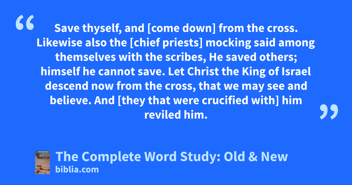 Save thyself, and [come down] from the cross. Likewise also the [chief priests] mocking said among themselves with the scribes, He saved others; himself he cannot save. Let Christ the King of Israel descend now from the cross, that we may see and believe. And [they that were crucified with] him reviled him.