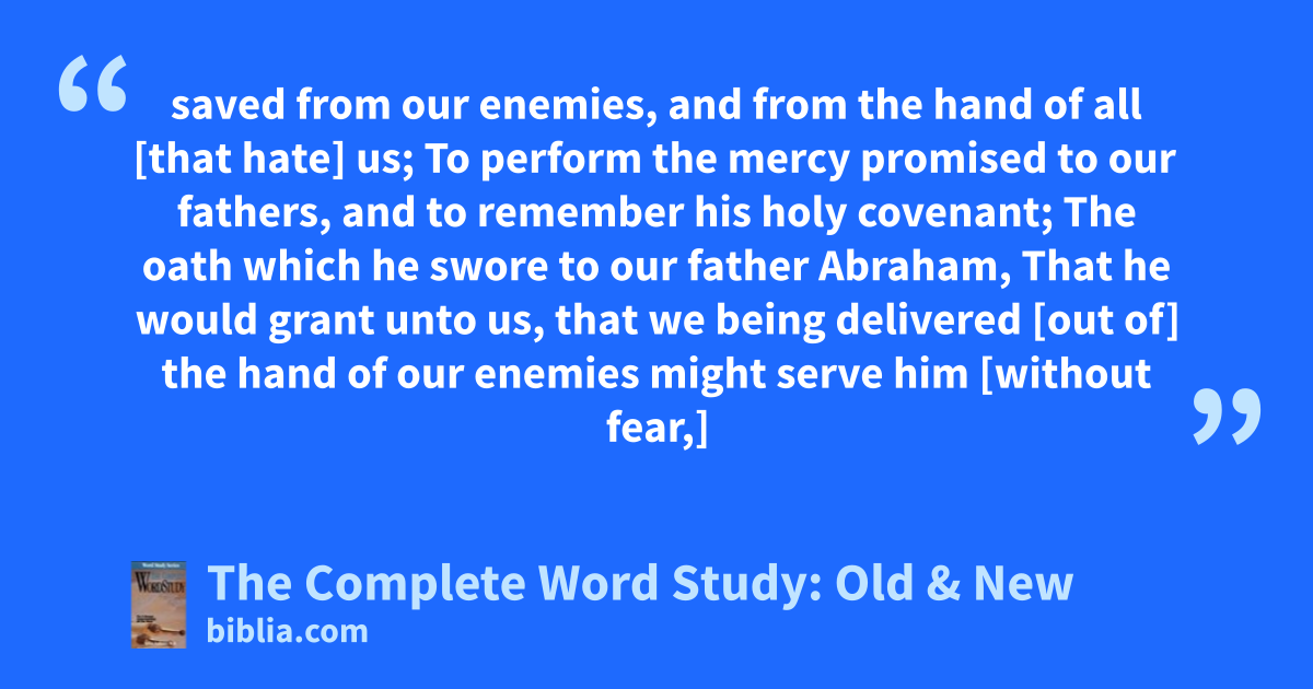 saved from our enemies, and from the hand of all [that hate] us; To perform the mercy promised to our fathers, and to remember his holy covenant; The oath which he swore to our father Abraham, That he would grant unto us, that we being delivered [out of] the hand of our enemies might serve him [without fear,]