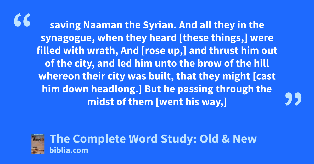 saving Naaman the Syrian. And all they in the synagogue, when they heard [these things,] were filled with wrath, And [rose up,] and thrust him out of the city, and led him unto the brow of the hill whereon their city was built, that they might [cast him down headlong.] But he passing through the midst of them [went his way,]