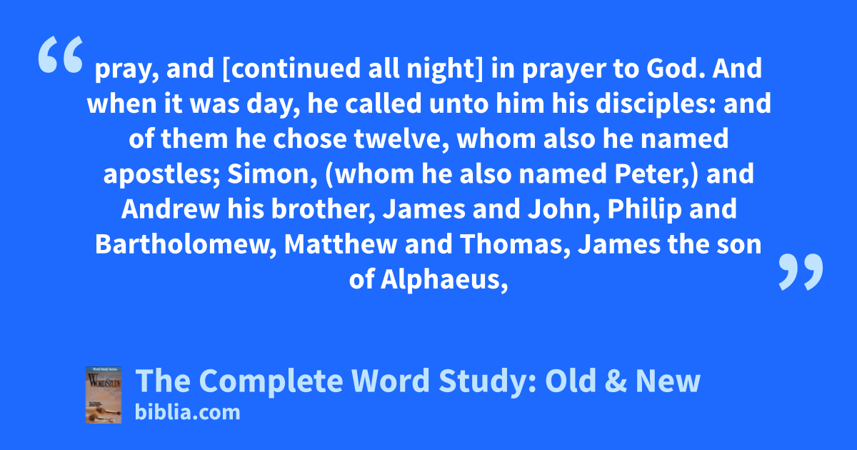 pray, and [continued all night] in prayer to God. And when it was day, he called unto him his disciples: and of them he chose twelve, whom also he named apostles; Simon, (whom he also named Peter,) and Andrew his brother, James and John, Philip and Bartholomew, Matthew and Thomas, James the son of Alphaeus,