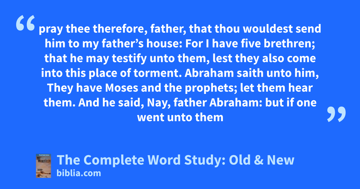 pray thee therefore, father, that thou wouldest send him to my father’s house: For I have five brethren; that he may testify unto them, lest they also come into this place of torment. Abraham saith unto him, They have Moses and the prophets; let them hear them. And he said, Nay, father Abraham: but if one went unto them