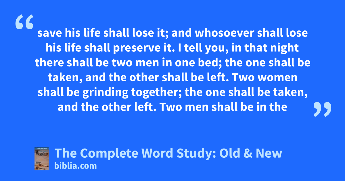 save his life shall lose it; and whosoever shall lose his life shall preserve it. I tell you, in that night there shall be two men in one bed; the one shall be taken, and the other shall be left. Two women shall be grinding together; the one shall be taken, and the other left. Two men shall be in the