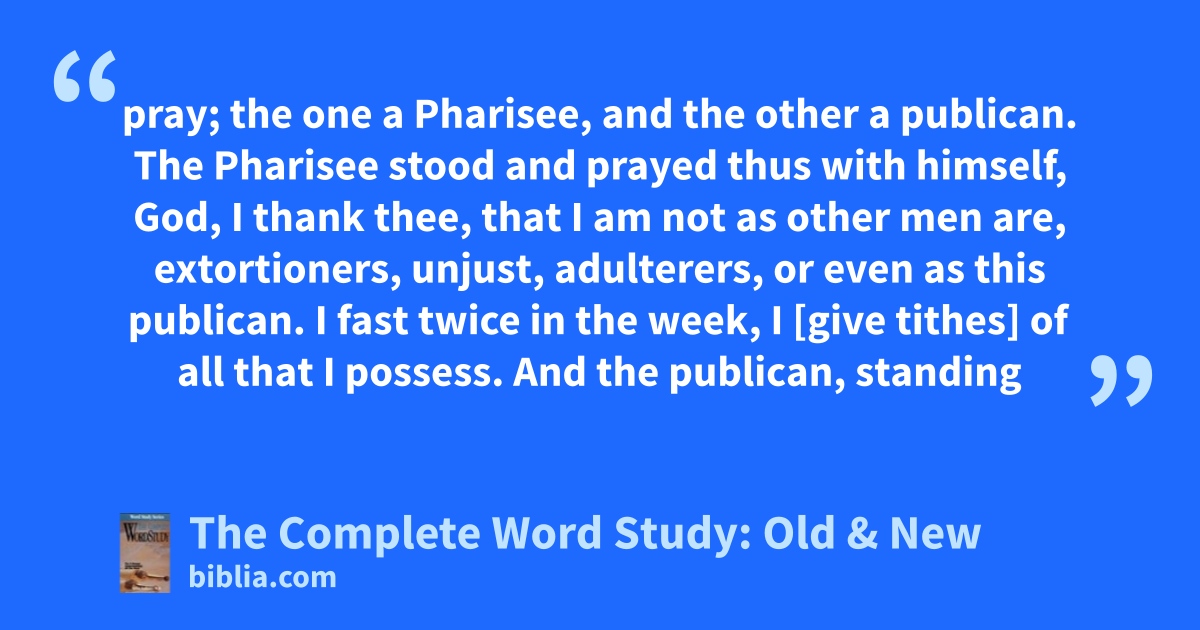 pray; the one a Pharisee, and the other a publican. The Pharisee stood and prayed thus with himself, God, I thank thee, that I am not as other men are, extortioners, unjust, adulterers, or even as this publican. I fast twice in the week, I [give tithes] of all that I possess. And the publican, standing