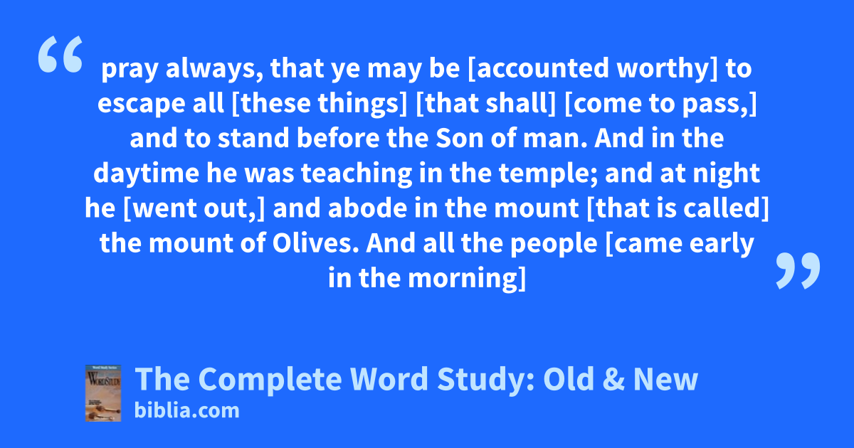 pray always, that ye may be [accounted worthy] to escape all [these things] [that shall] [come to pass,] and to stand before the Son of man. And in the daytime he was teaching in the temple; and at night he [went out,] and abode in the mount [that is called] the mount of Olives. And all the people [came early in the morning]