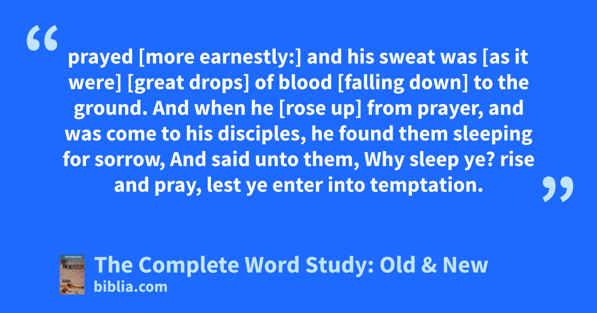 prayed [more earnestly:] and his sweat was [as it were] [great drops] of blood [falling down] to the ground. And when he [rose up] from prayer, and was come to his disciples, he found them sleeping for sorrow, And said unto them, Why sleep ye? rise and pray, lest ye enter into temptation.