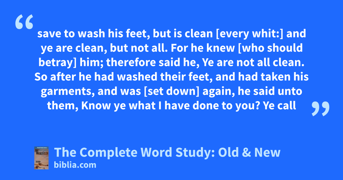 save to wash his feet, but is clean [every whit:] and ye are clean, but not all. For he knew [who should betray] him; therefore said he, Ye are not all clean. So after he had washed their feet, and had taken his garments, and was [set down] again, he said unto them, Know ye what I have done to you? Ye call