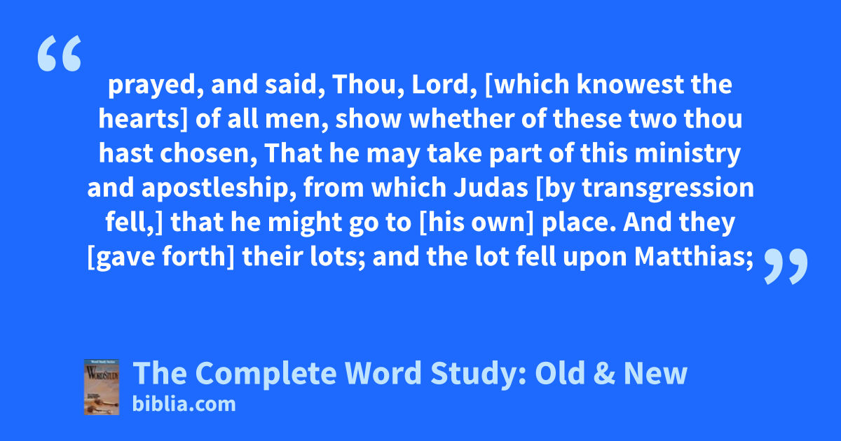 prayed, and said, Thou, Lord, [which knowest the hearts] of all men, show whether of these two thou hast chosen, That he may take part of this ministry and apostleship, from which Judas [by transgression fell,] that he might go to [his own] place. And they [gave forth] their lots; and the lot fell upon Matthias;