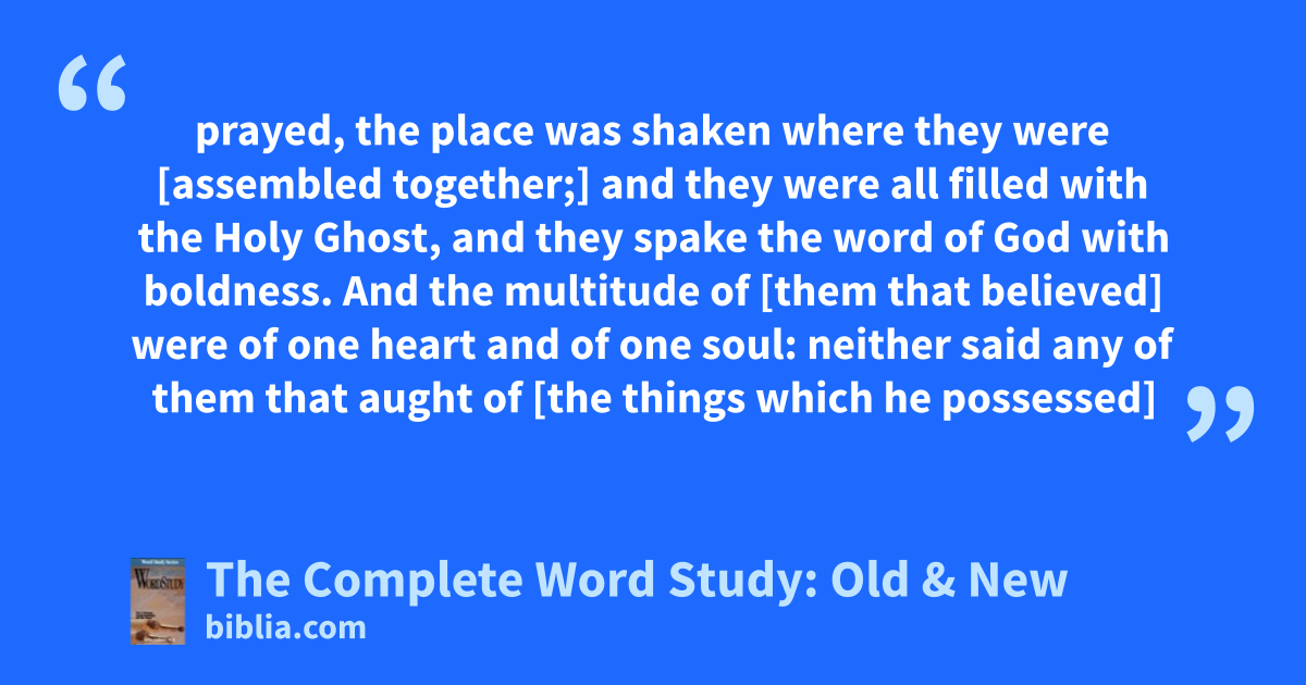 prayed, the place was shaken where they were [assembled together;] and they were all filled with the Holy Ghost, and they spake the word of God with boldness. And the multitude of [them that believed] were of one heart and of one soul: neither said any of them that aught of [the things which he possessed]
