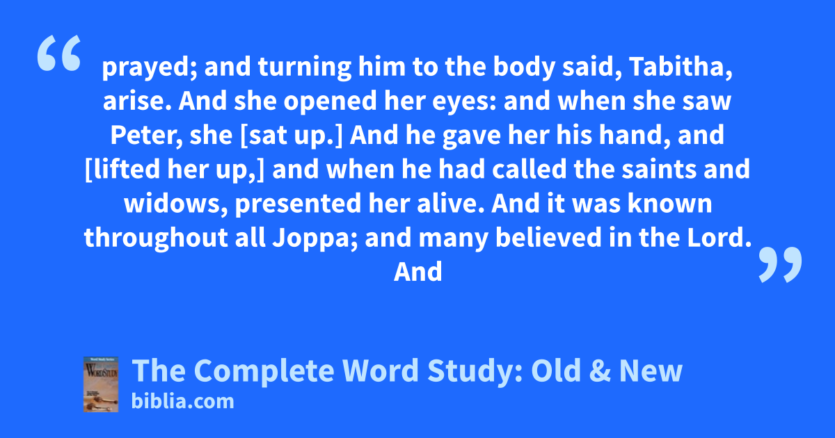 prayed; and turning him to the body said, Tabitha, arise. And she opened her eyes: and when she saw Peter, she [sat up.] And he gave her his hand, and [lifted her up,] and when he had called the saints and widows, presented her alive. And it was known throughout all Joppa; and many believed in the Lord. And