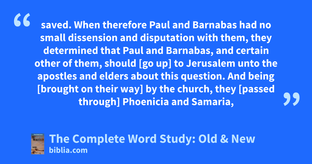 saved. When therefore Paul and Barnabas had no small dissension and disputation with them, they determined that Paul and Barnabas, and certain other of them, should [go up] to Jerusalem unto the apostles and elders about this question. And being [brought on their way] by the church, they [passed through] Phoenicia and Samaria,