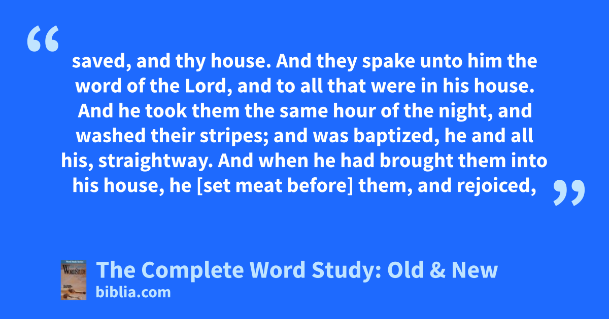 saved, and thy house. And they spake unto him the word of the Lord, and to all that were in his house. And he took them the same hour of the night, and washed their stripes; and was baptized, he and all his, straightway. And when he had brought them into his house, he [set meat before] them, and rejoiced,