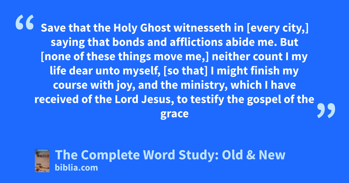Save that the Holy Ghost witnesseth in [every city,] saying that bonds and afflictions abide me. But [none of these things move me,] neither count I my life dear unto myself, [so that] I might finish my course with joy, and the ministry, which I have received of the Lord Jesus, to testify the gospel of the grace