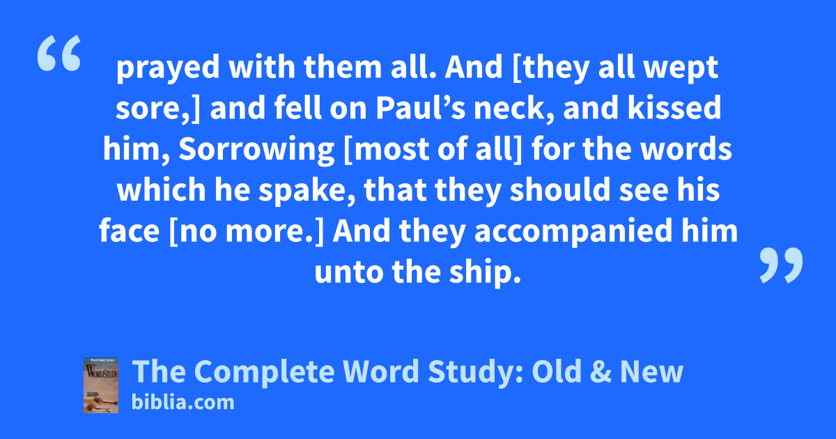 prayed with them all. And [they all wept sore,] and fell on Paul’s neck, and kissed him, Sorrowing [most of all] for the words which he spake, that they should see his face [no more.] And they accompanied him unto the ship.