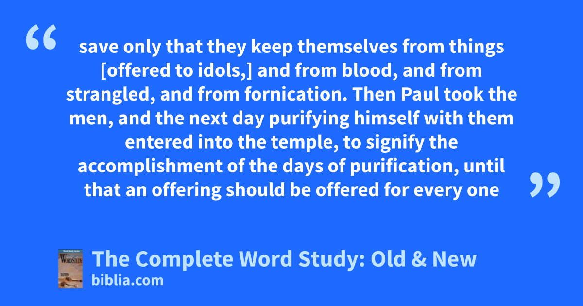 save only that they keep themselves from things [offered to idols,] and from blood, and from strangled, and from fornication. Then Paul took the men, and the next day purifying himself with them entered into the temple, to signify the accomplishment of the days of purification, until that an offering should be offered for every one