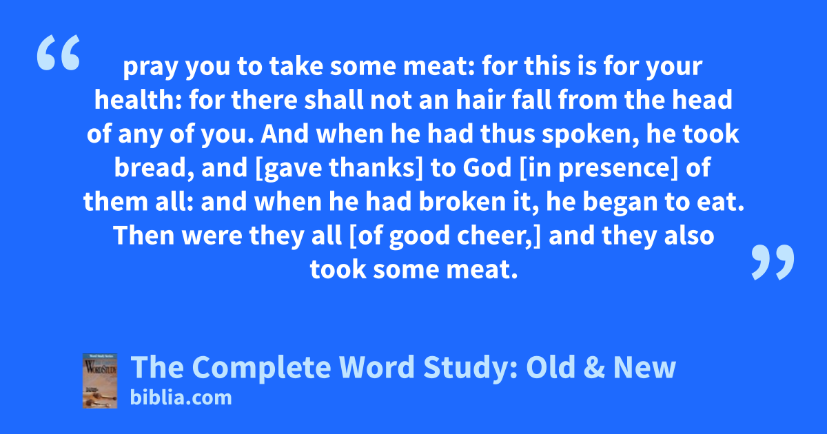 pray you to take some meat: for this is for your health: for there shall not an hair fall from the head of any of you. And when he had thus spoken, he took bread, and [gave thanks] to God [in presence] of them all: and when he had broken it, he began to eat. Then were they all [of good cheer,] and they also took some meat.